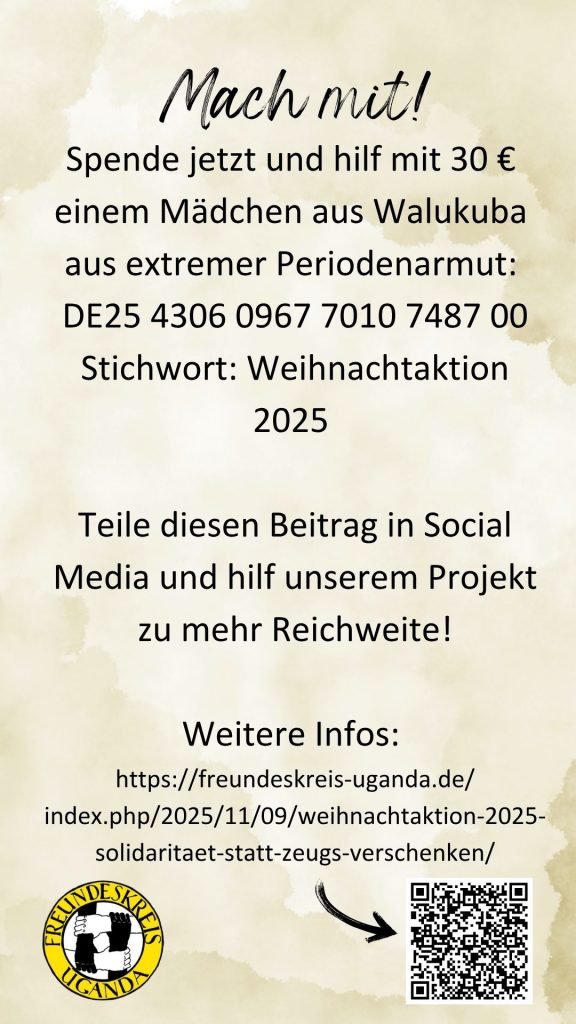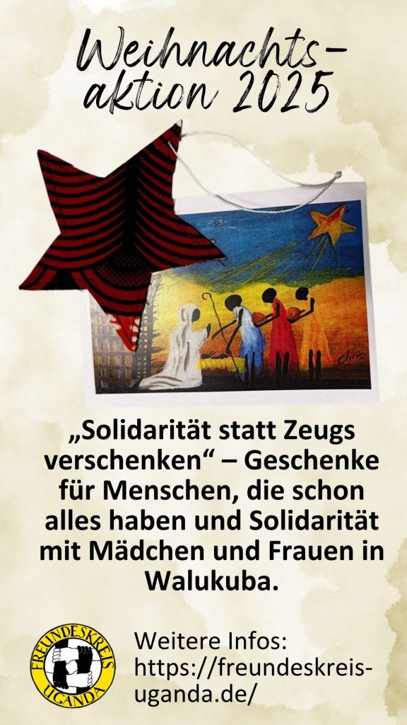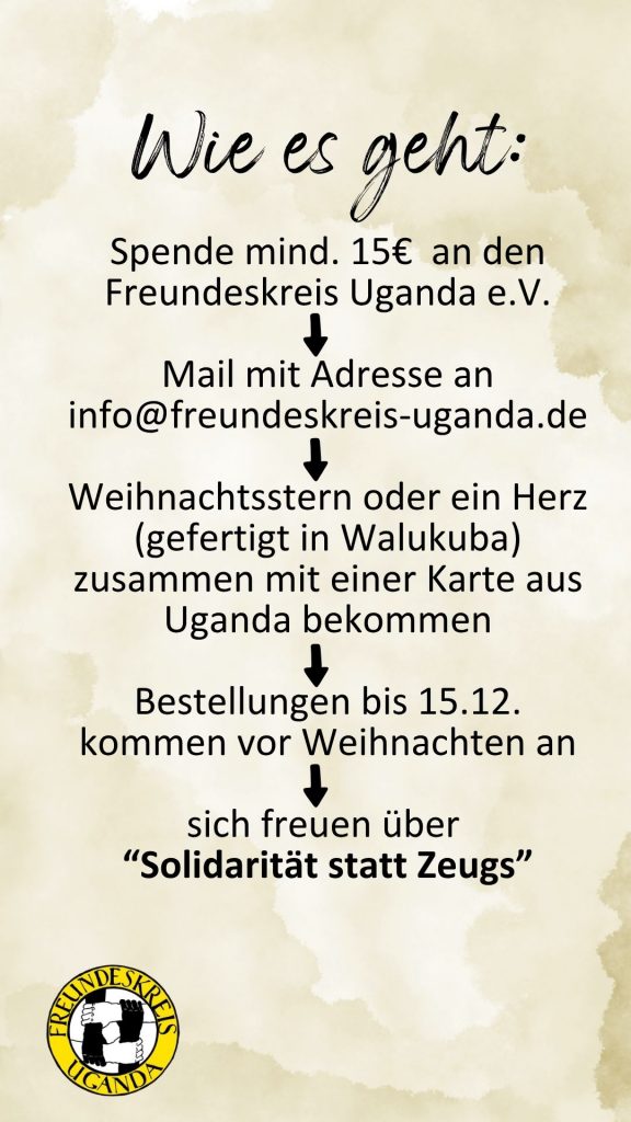 Zur Aktion letztes Jahr und noch mehr Hintergründe zum Projekt: https://freundeskreis-uganda.de/index.php/2024/11/18/weihnachtaktion-2024-solidaritaet-statt-zeugs-verschenken/